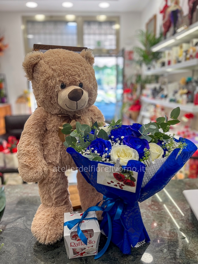 Peluche 70 cm + Mazzo di Rose BLU + scatola di cioccolatini